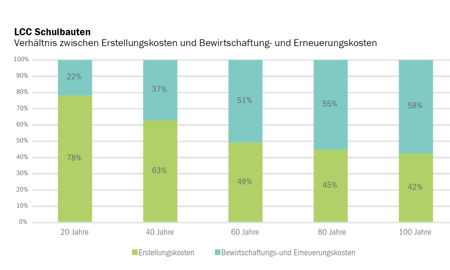- Die Analyse zeigt, dass die gängige Faustregel (20% Investitions-, 80% Folgekosten) bei keinem einzigen Objekttyp effektiv nachgewiesen werden kann. Bei einer angenommenen Lebensdauer von 60 Jahren beläuft sich das Verhältnis von Investitions- zu Folgekosten bei allen Objekttypen auf etwa 50 zu 50 Prozent.