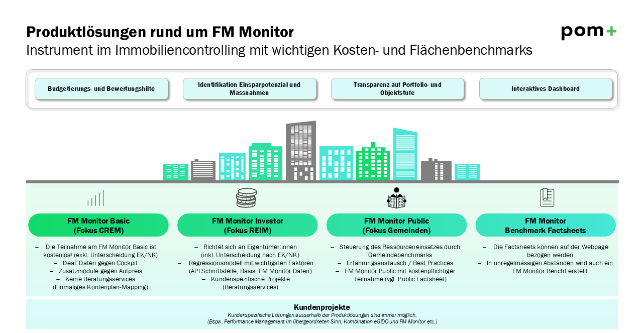 Der FM Monitor ist beinahe so alt, wie pom+ selbst: Seit rund 25 Jahren erfasst und analysiert er systematisch Daten zu Betriebskosten und Flächeneffizienzen und hat sich als ein wichtiges Werkzeuge im Immobiliencontrolling etabliert. Für insgesamt 13 Objekttypen aus unterschiedlichen Branchen werden jährlich umfassende Kosten- und Flächenkennzahlen ermittelt, die eine fundierte Basis für strategische Entscheidungen liefern.
