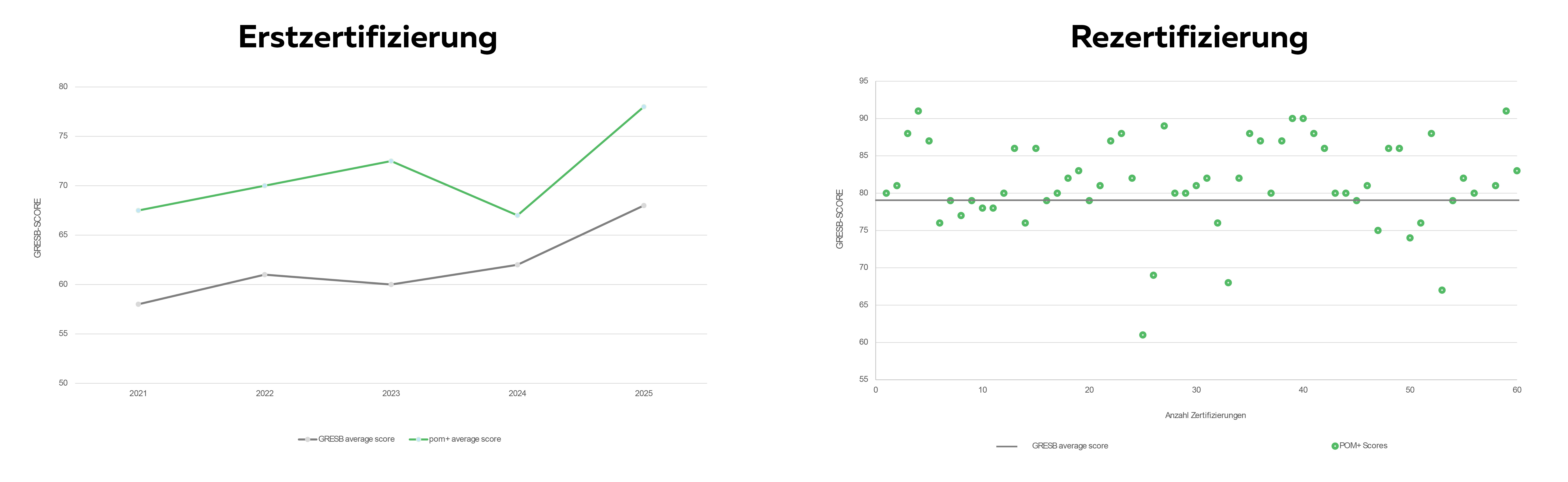 pom+ hat 2025 22 Unternehmen und über 100 Fonds im gesamten GRESB-Prozess begleitet – von der Datensammlung über die Eingabe bis zur Ergebnisinterpretation und Ableitung konkreter Massnahmen. Unsere Kund:innen erzielen in der Erstzertifizierung im Schnitt 9 Punkte mehr als der globale Durchschnitt. Auch in der Rezertifizierung liegen sie stabil 5 Punkte über dem Benchmark.