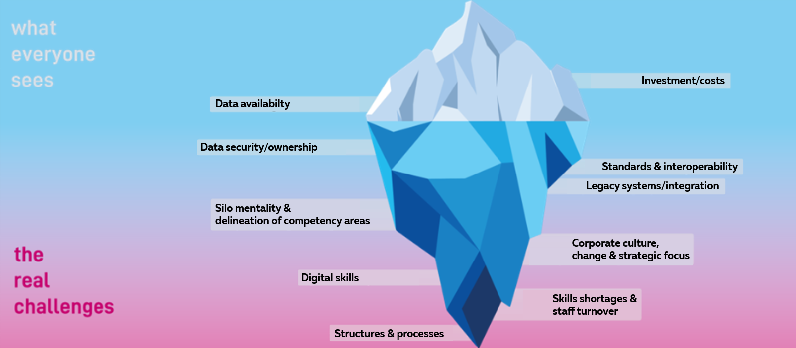 When asked about the obstacles to digital transformation, participants agree that investment and costs, as well as data availability, security and sovereignty, are at the top of the list of challenges. However, it is often realised (too) late just how many other challenges lie lurking beneath the surface.