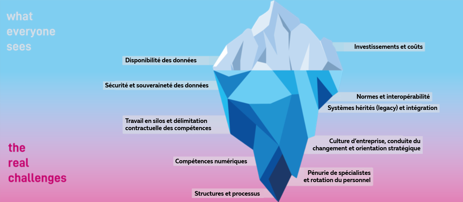 Interrogés sur les obstacles à la transformation digitale, les participant·e·s s’accordent à dire que les investissements et les coûts ainsi que la disponibilité, la sécurité et la souveraineté des données figurent en tête des défis. En revanche, la profondeur de nombreux autres obstacles — qui restent sous la surface — n’est souvent reconnue que tardivement, parfois trop tard.