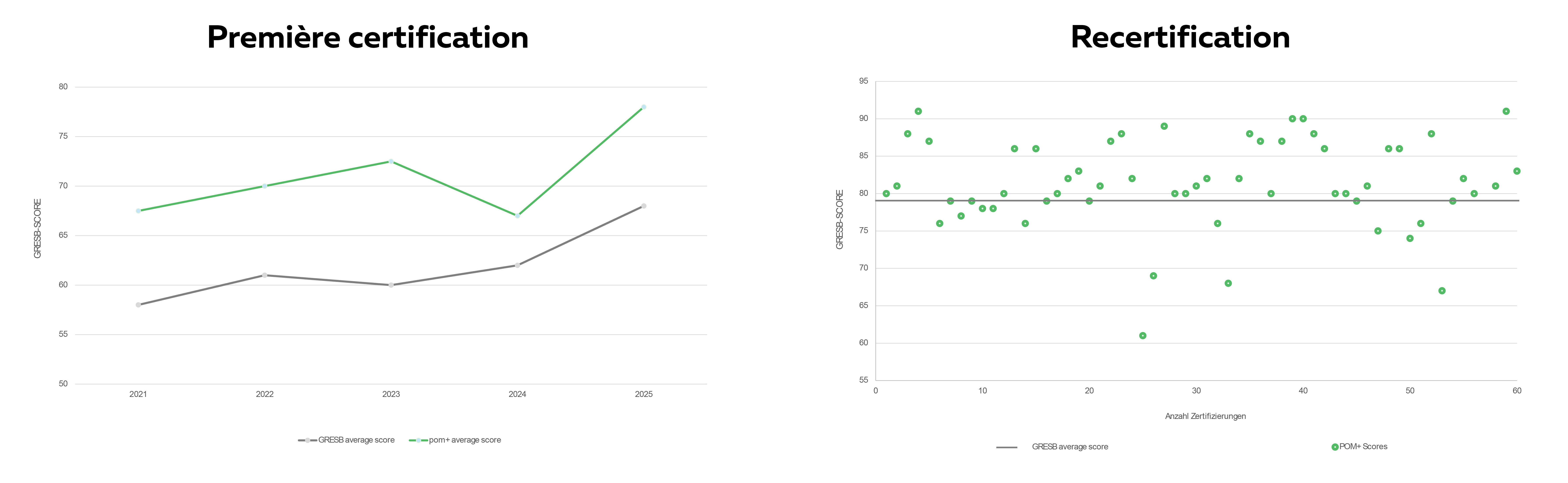 En 2025, pom+ a accompagné 22 entreprises et plus de 100 fonds sur l’ensemble du processus GRESB – de la collecte à l’interprétation des résultats et à la définition des mesures. En première certification, nos client·e·s obtiennent en moyenne 9 points de plus que la moyenne mondiale, et 5 points de plus en recertification.